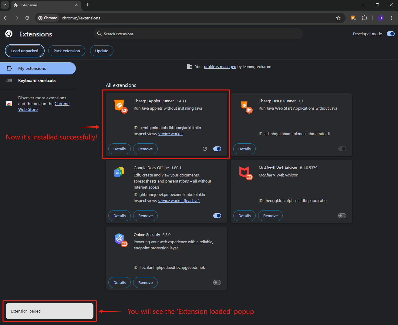 Once installed, the Extension loaded popup will appear in the bottom left corner and the extension should appear in your list of extensions. You can now manage its settings or remove it from this page.