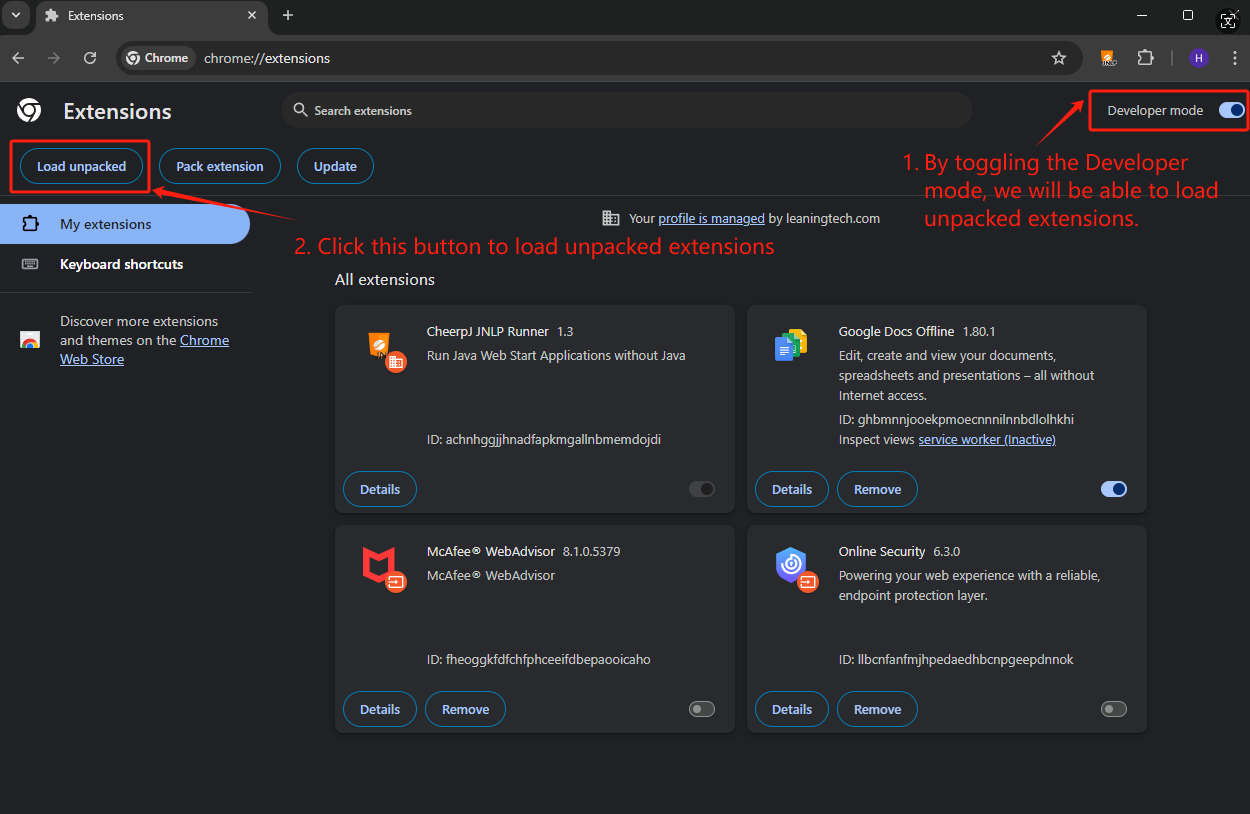 Let’s now toggle the Developer mode switch to enable it at the top-right of the Extensions page. This allows you to load unpacked extensions.