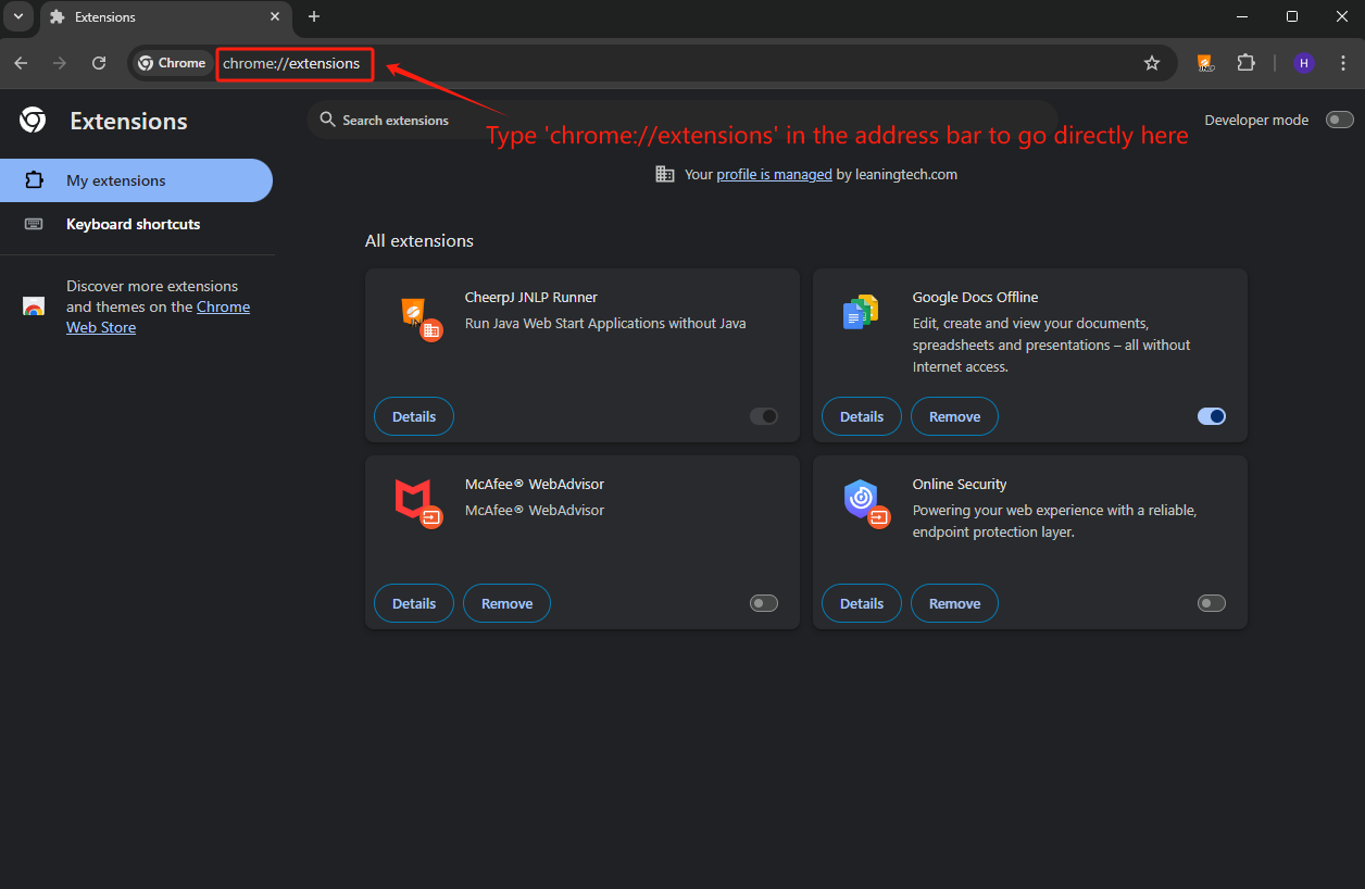 Alternatively, you can type chrome://extensions/ in the address bar to go directly there.